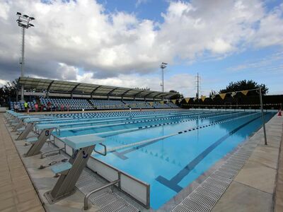Build according to Olympic standards, 50m x 25m with 10 lanes. All kinds of water sports may be hosted. The pool is heated during winter months. It has a seating capacity of 700 covered seats and all necessary facilities: